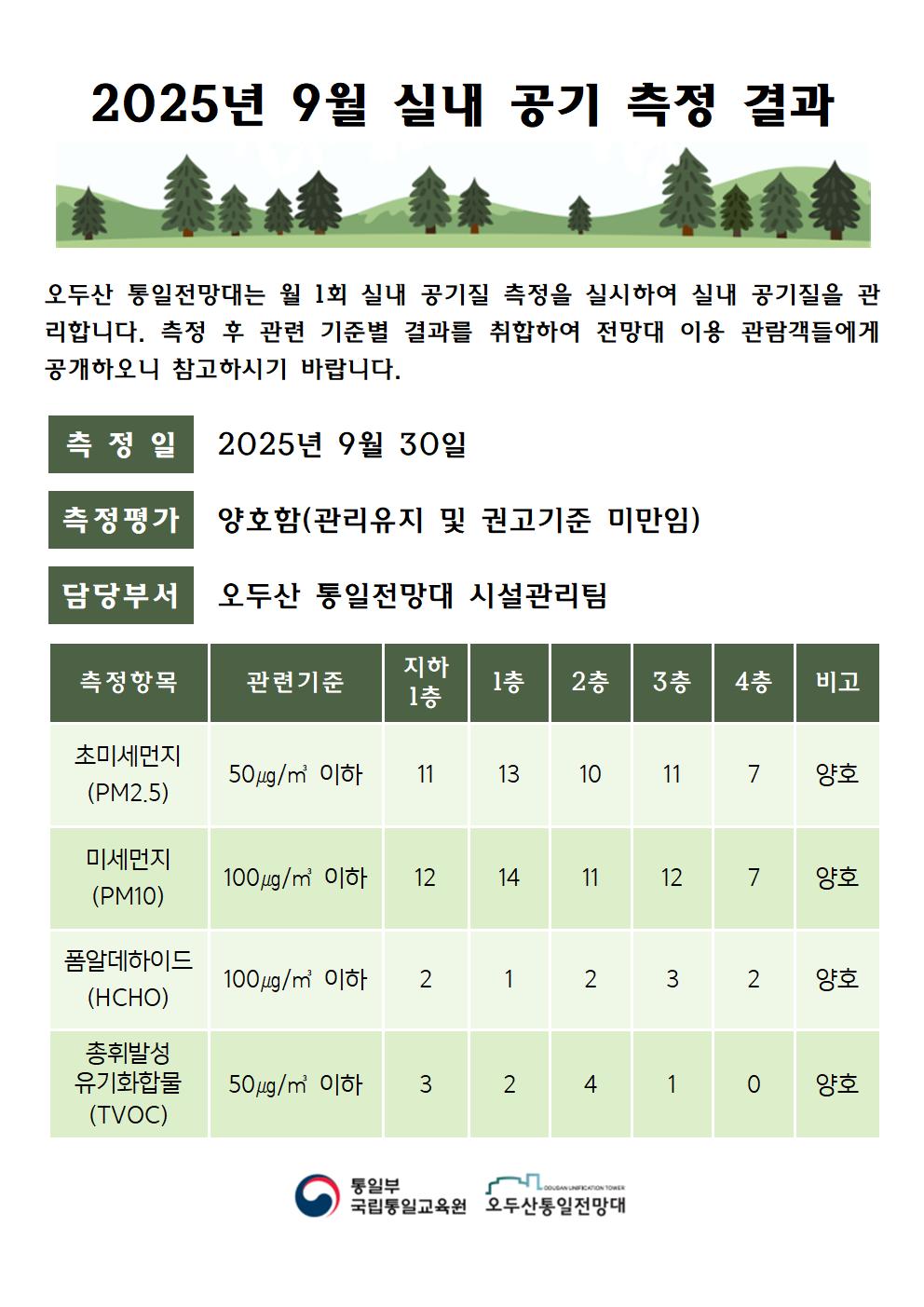 [안내] 오두산통일전망대 9월 공기질 자체측정 결과