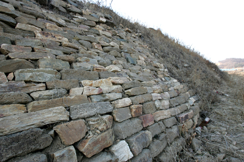"백제식 축성기법(정상부를 띠로 두르듯 쌓았고, 산기슭을 ㄴ 자로 파내고 한 쪽만 석축한 성)을 충실하게 따르고 있어요.